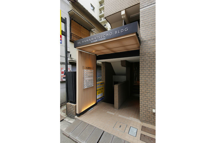 1階のテナント看板よりも道路側へサイン庇を持ち出し、入口位置をアピール。